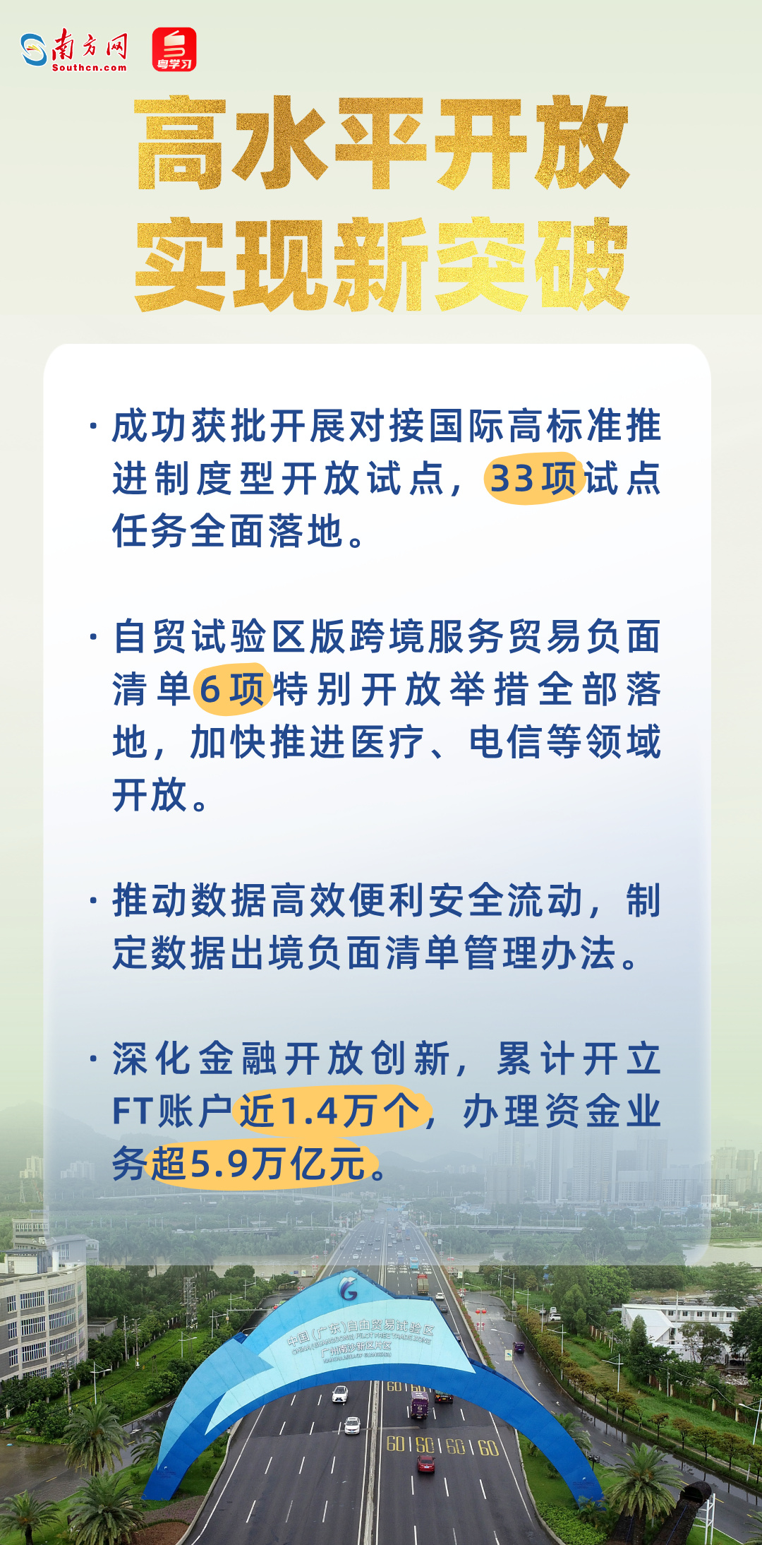 中共二十届四中全会提出,继续扩大制度开放,维护多边贸易体制,扩大国际流通,以开放促改革发展,与世界各国共享机遇、共同发展。广东自贸试验区自成立以来,坚持以制度创新为核心,加快推动高水平开放和质量发展,日益成为改革创新的“试验田”和对外开放的“新高地”。今年是广东自贸试验区成立十周年。让我们看看所取得的里程碑式成果